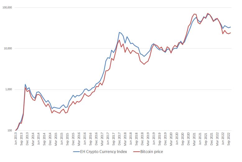 A legtöbb alap azonban megmaradt az egyszerű tartásnál, ahogy a lenti ábrából is láthatjuk. A 14 kriptóval foglalkozó hedge fundot tömörítő Eurekahedge Crypto Currency Index teljesítményét láthatjuk az elmúlt bő 9 évben a bitcoin árfolyamához képest. Ahogy láthatjuk, a bitcoin árfolyammozgása szinte teljes mértékben magyarázta az index teljesítményét, vagyis ezek szinte mind olyan alapok, amik „buy and hold” stratégiát alkalmaznak.